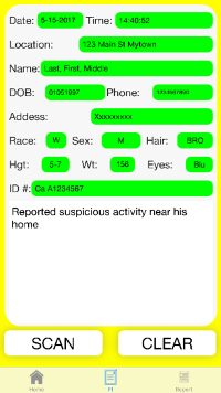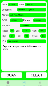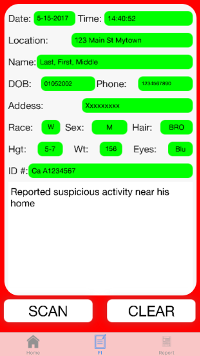 This App utilizes the user’s geolocation to record location information for the user’s personal use only in preparing field interview reports. This App also scans information from government issued identification cards for the personal use of the user to assist in preparing field interview reports. No information gathered by this app is transmitted to the developer during normal operation of the App. Information may be transferred to the developer for software testing and debugging purposes only. This happens if deemed necessary and with the consent of the individual user. Any information transferred to the developer will be retained only as long as needed to make the necessary improvements to the App.